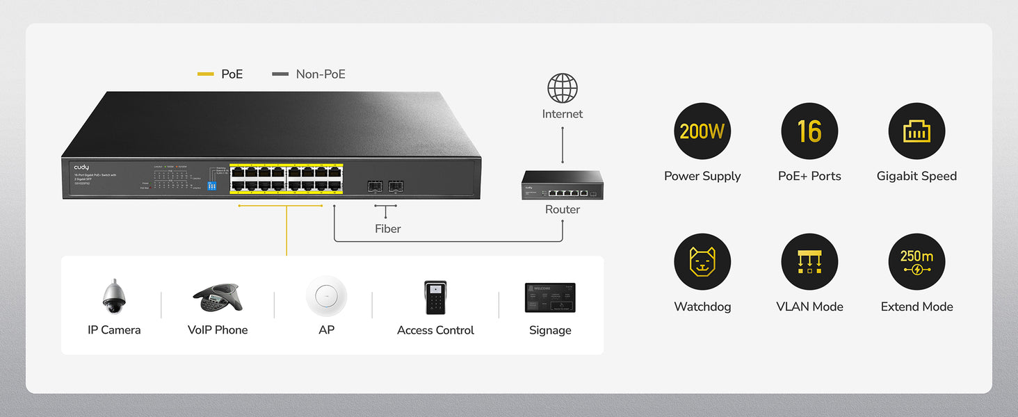 - 16-GbE PoE, 2-SFP, Light-Managed
