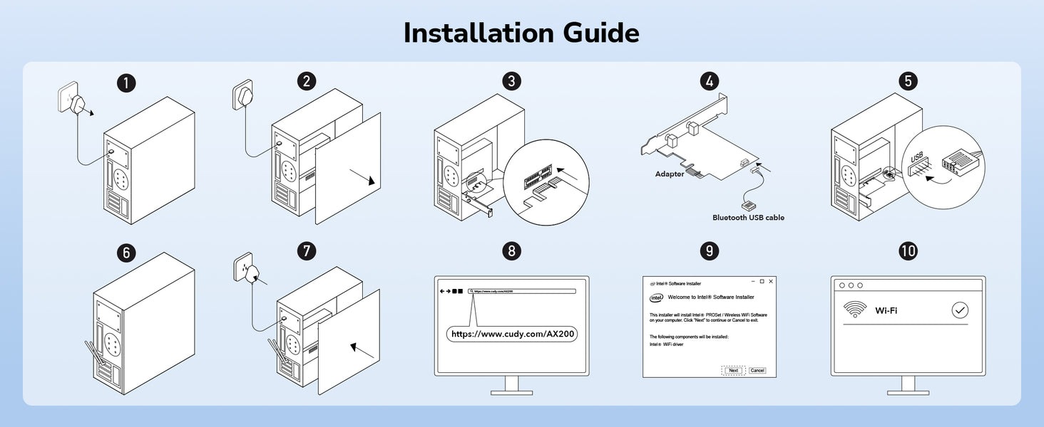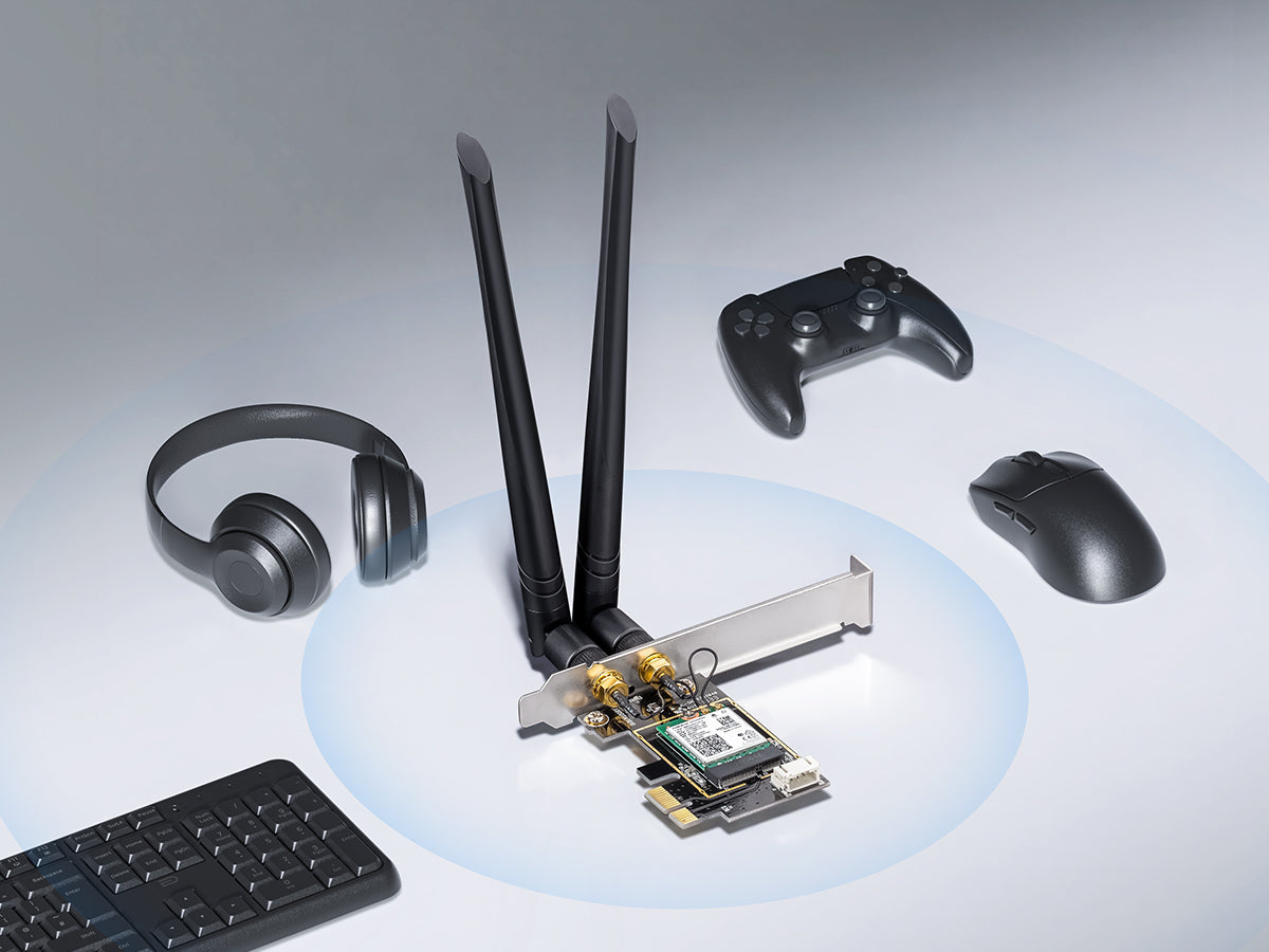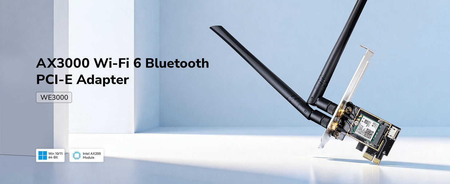 A Wi-Fi 6 and Bluetooth PCI-E adapter built on an AX200 Intel module. Install it to equip your Windows 10/11 PC with advanced wireless connectivity.