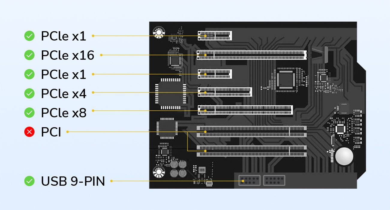 The Wi-Fi and powering requires a PCI-E 1x, 4x, 8x, or 16x slot on the motherboard. The Bluetooth function requires a USB 9-Pin connector on the motherboard.