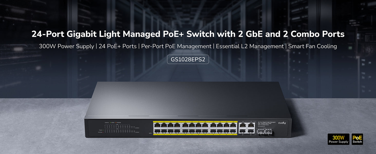 - 24-GbE PoE, 4-Combo, L2, 400W