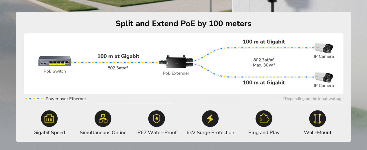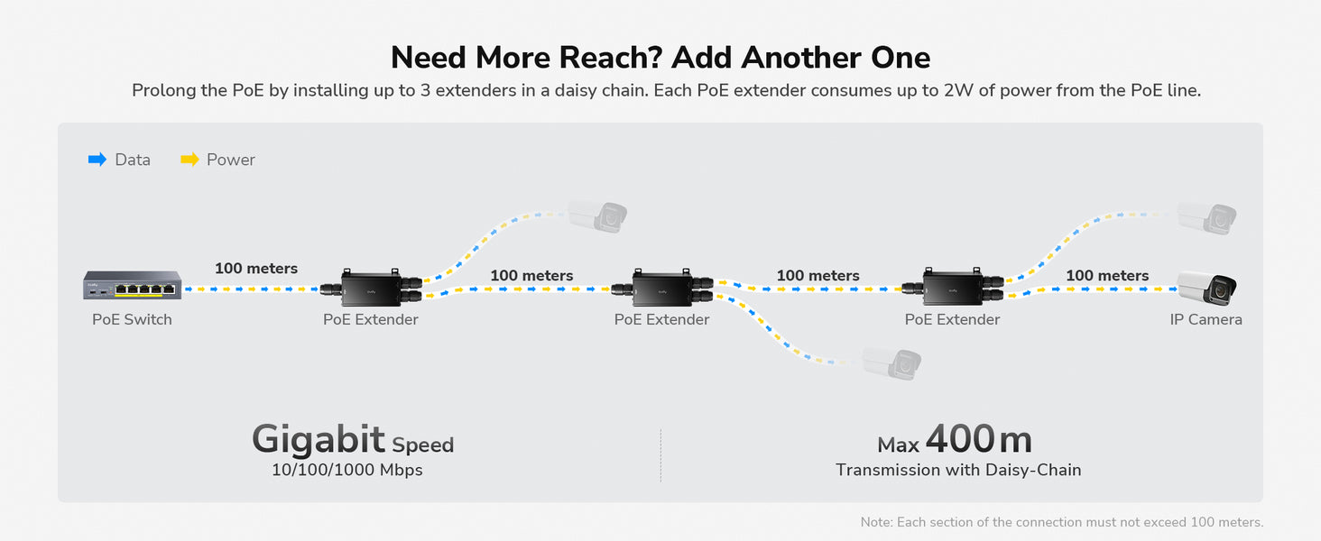 - 100m extension is measured from the GbE out to the client devices. The section between uplink switch and GbE In is determined by the uplink switch.