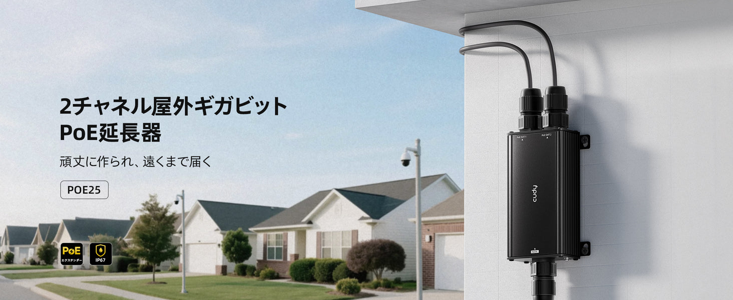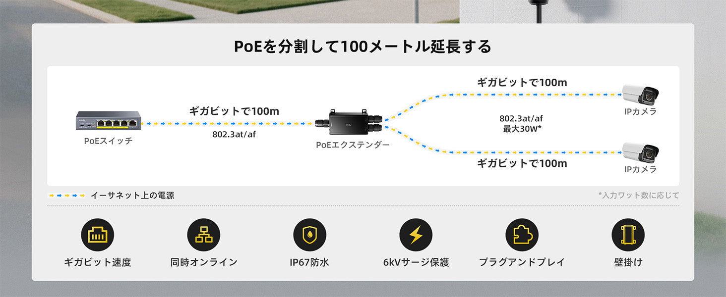 - 実際に利用可能な電力は, アップリンク電力から回線損失とデバイス自身の消費電力を差し引いた値になります(消費電力は仕様書をご覧ください)。54Vの標準IEEE PoE規格に対応するPoEスイッチを推奨します。