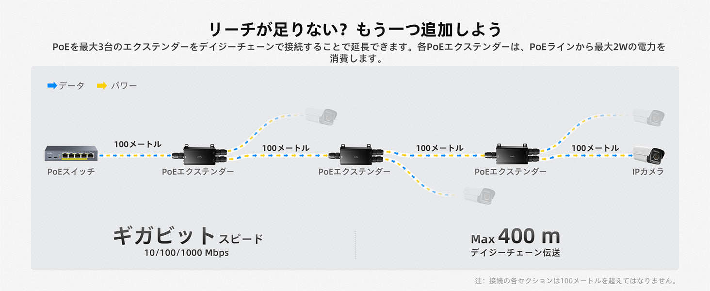 - 100mの延長は, GbE出力からクライアントデバイスまで測定されます。アップリンクスイッチとGbE入力間の区間は, アップリンクスイッチによって決定されます。