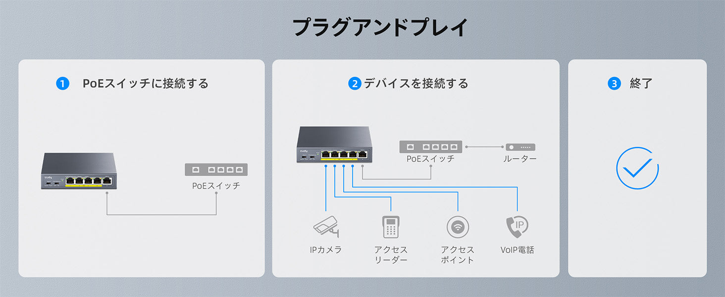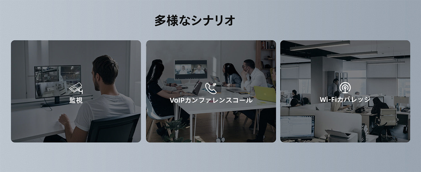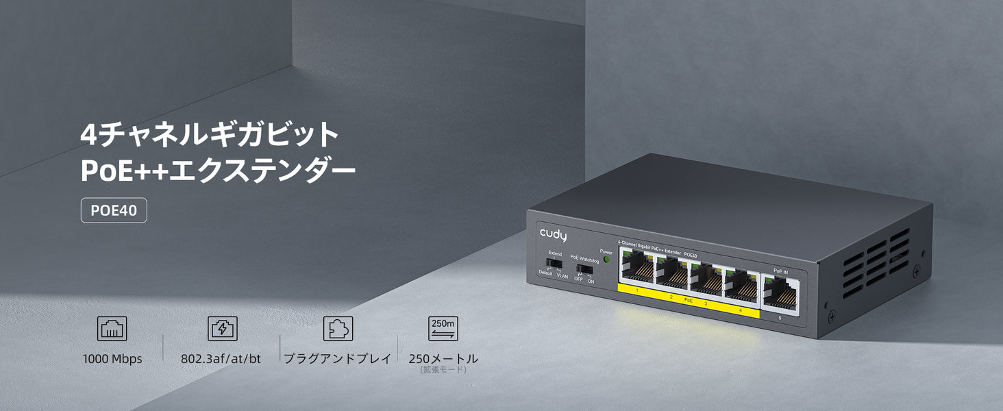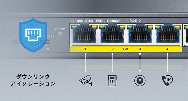 - 実際に利用可能な電力は, アップリンク電力から回線損失とデバイス自身の消費電力を差し引いた値になります(消費電力は仕様書をご覧ください)。54Vの標準IEEE PoE規格に対応するPoEスイッチを推奨します。