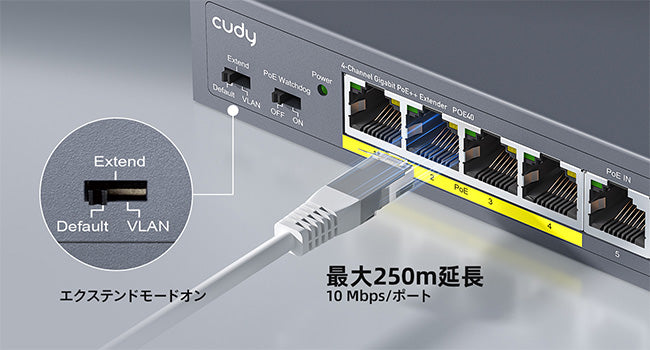 - 100mの延長は, GbE出力からクライアントデバイスまで測定されます。アップリンクスイッチとGbE入力間の区間は, アップリンクスイッチによって決定されます。