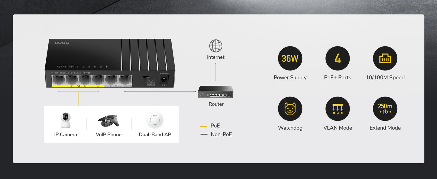 - 4-GbE PoE, 1-GbE, 1-SFP