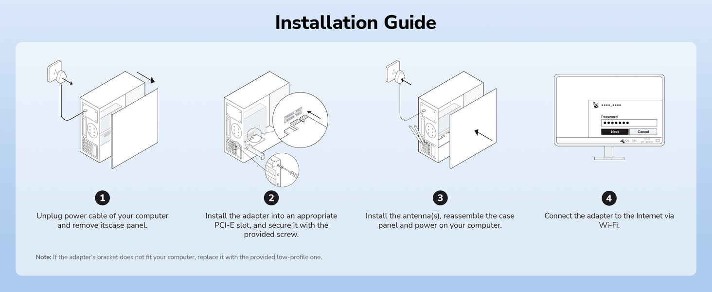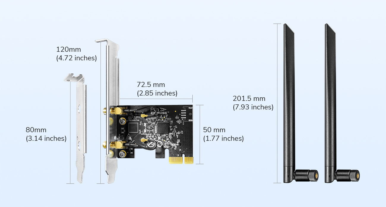 | Requirements | Hardware Requirement | Requires a PCI-E 1x or higher standard slot on the motherboard for powering and the WiFi function |