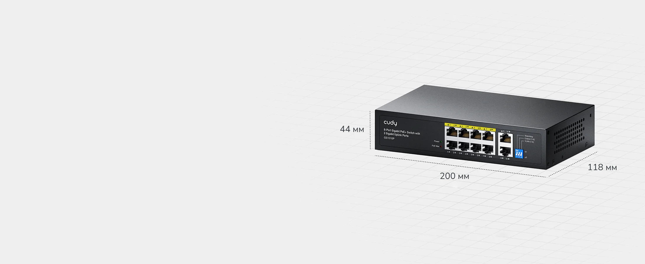 | Индикаторы | Power (питание); у каждого порта Ethernet: Link (соединение)‚ Act (активность); PoE Max Status (максимальная нагрузка PoE) | |
