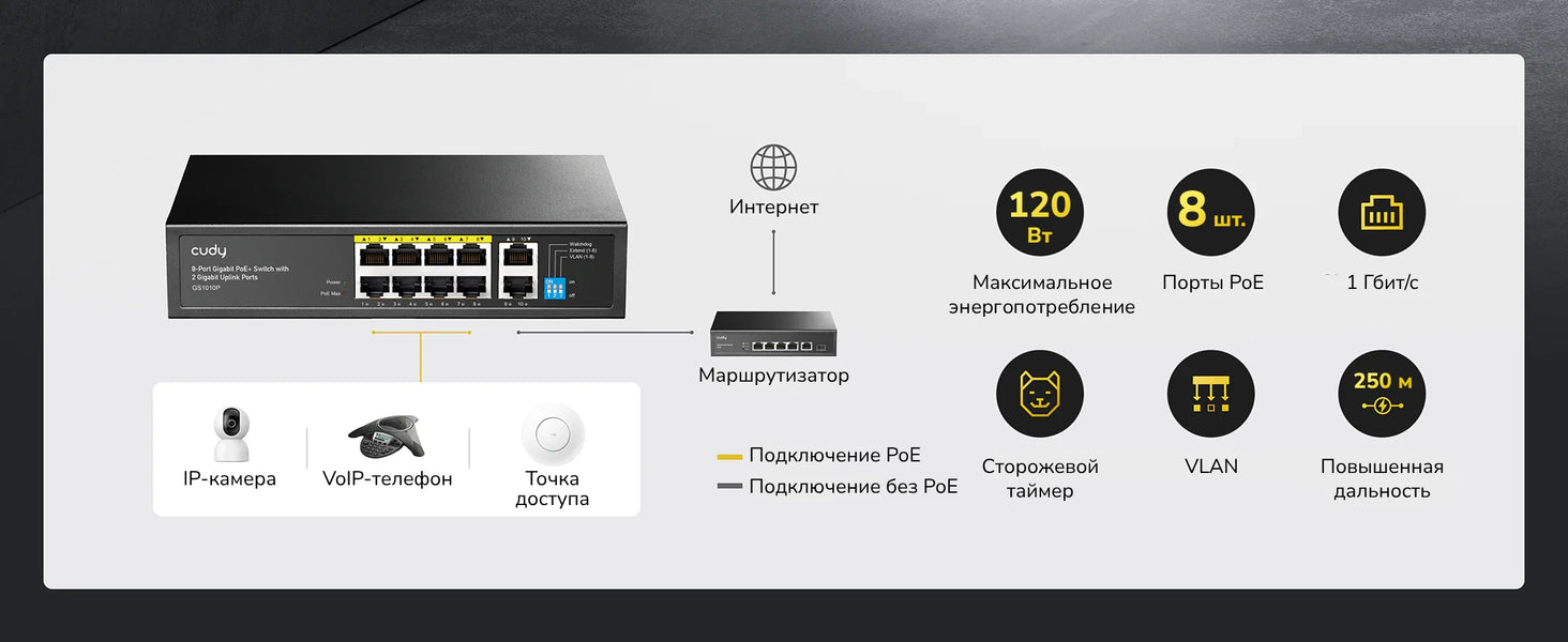 | Физические кнопки | Extend (режим повышенной дальности)‚ VLAN‚ PoE Watchdog (сторожевой таймер PoE) | |