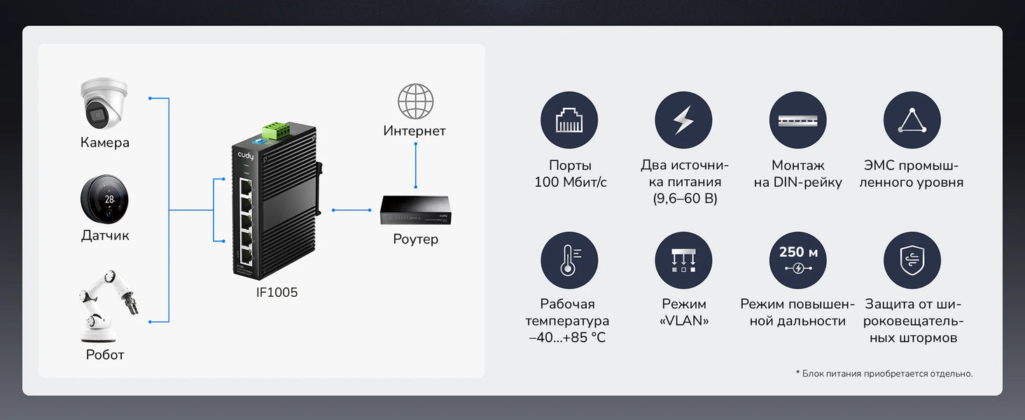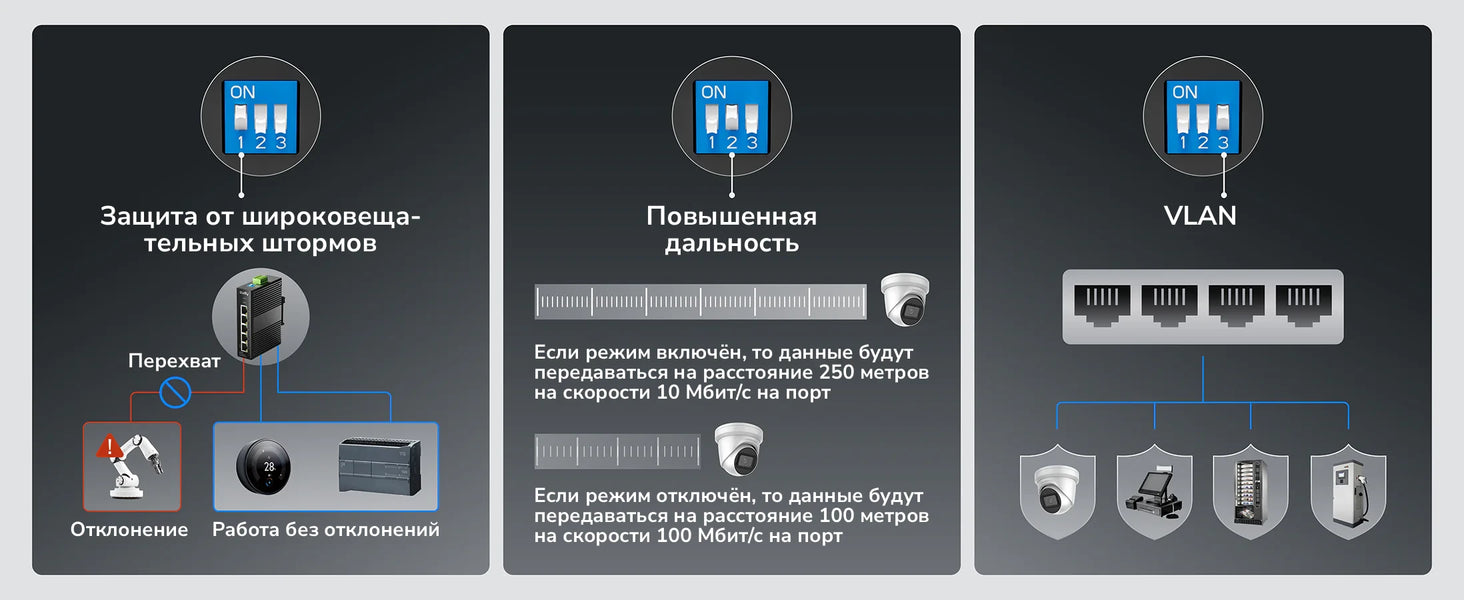 | Физические кнопки | VLAN‚ Extend (режим повышенной дальности)‚ Broadcast Storm Prevention (защита от широковещательных штормов) | |