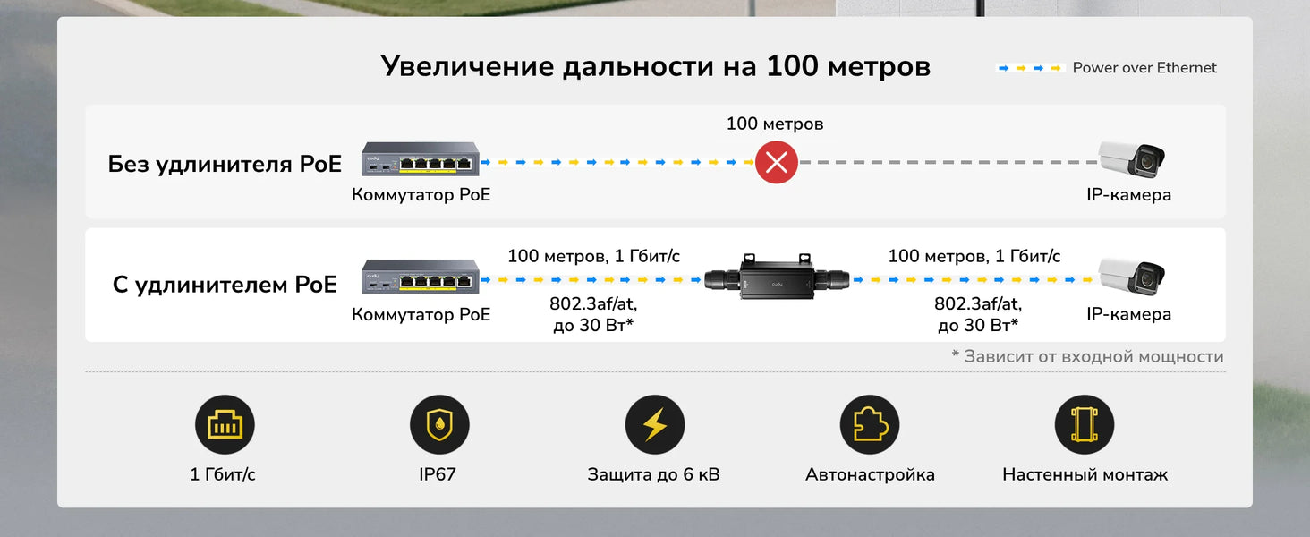 - Фактическая доступная мощность может отличаться от заявленной. Доступная мощность рассчитывается по следующей формуле: [мощность Uplink] – [потери по линии связи] – [мощность, потребляемая самим устройством (см. параметр «Энергопотребление» в разделе «Характеристики» на сайте или в паспорте изделия)]. Рекомендуется использовать коммутатор PoE с напряжением 54 В.