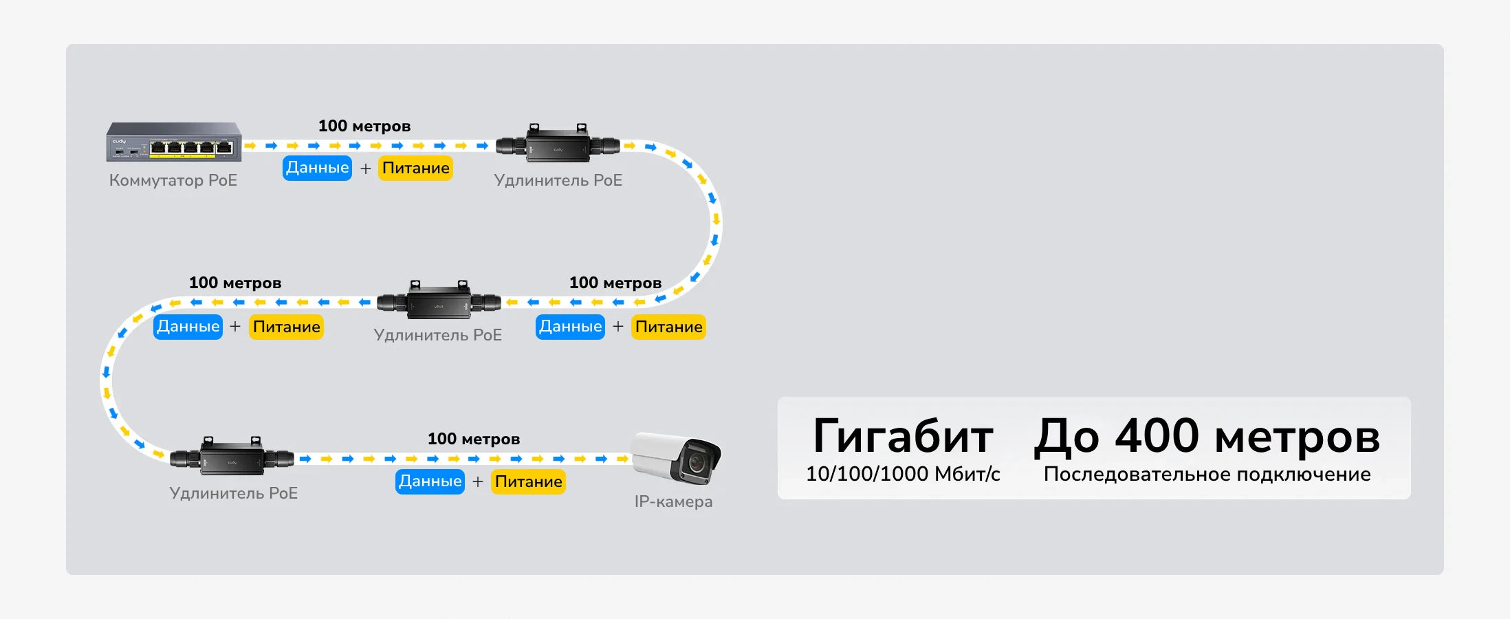 - Указанное расстояние — это протяжённость кабеля от выходного гигабитного порта устройства Cudy до клиентского устройства. Максимальная протяжённость кабеля между коммутатором Uplink и входным гигабитным портом устройства Cudy зависит от возможностей коммутатора Uplink.