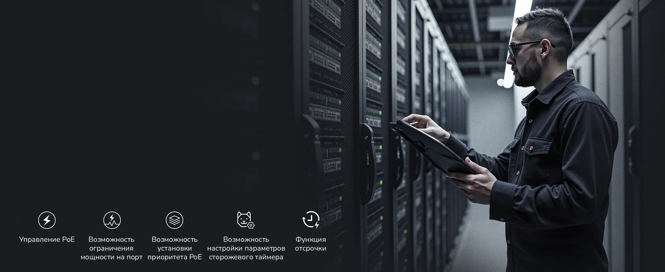 | Коммутация | Управление PoE | Настройка приоритета PoE‚ включение (отключение) сторожевого таймера PoE‚ настройка порогового значения сторожевого таймера PoE (время‚ количество пакетов)‚ энергопотребление PoE‚ стандарт PoE‚ отсрочка подачи питания по PoE‚ общий бюджет PoE‚ бюджет PoE на порт |