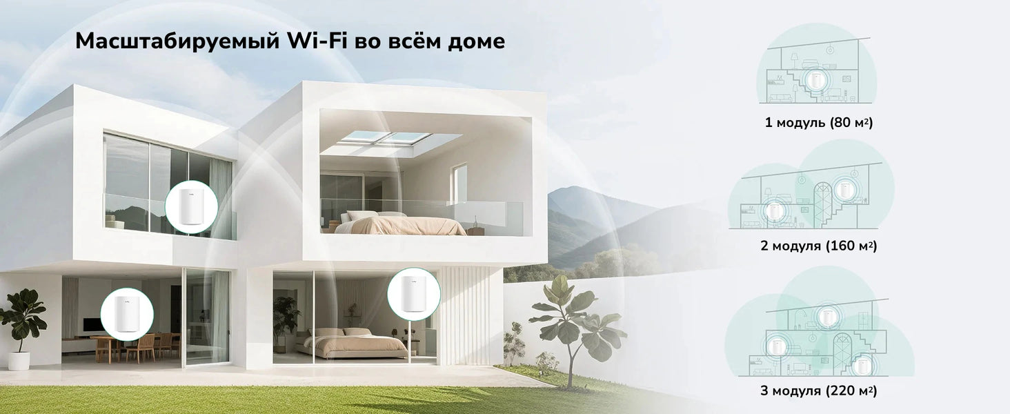 2 модуля: 160 м² 3 модуля: 220 м² Информация для устройств‚ которые подключены друг к другу по Wi-Fi (транзитное соединение Wi-Fi). Устройства должны быть размещены в центре этажа‚ при этом в каждой комнате должно быть не более двух преград. |
