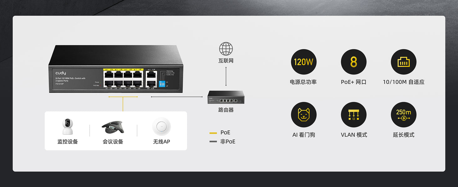 | 网线传输距离和速率注释 | 在开启延长模式时,延长模式端口支持250米远距离传输。 | |