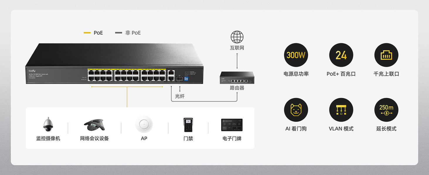| 网线传输距离和速率注释 | 仅上联网口支持千兆传输。 在开启延长模式时,延长模式端口支持250米远距离传输。 | |