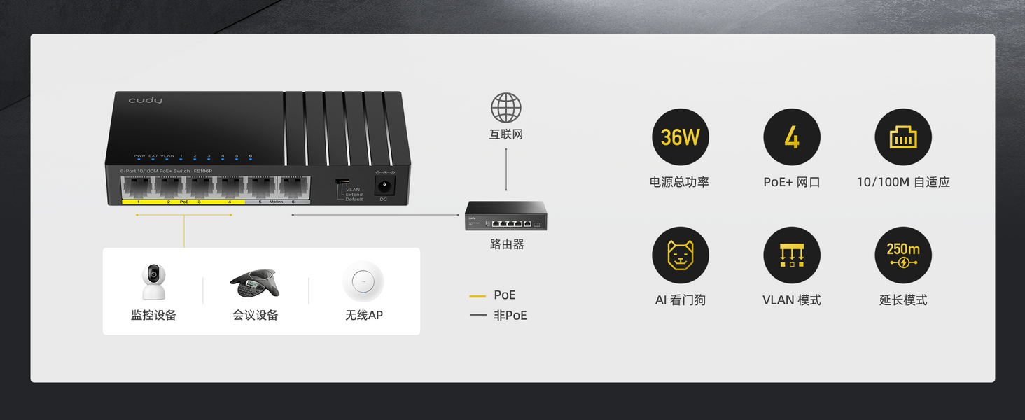 | 网线传输距离和速率注释 | 在开启延长模式时,延长模式端口支持250米远距离传输。 | |