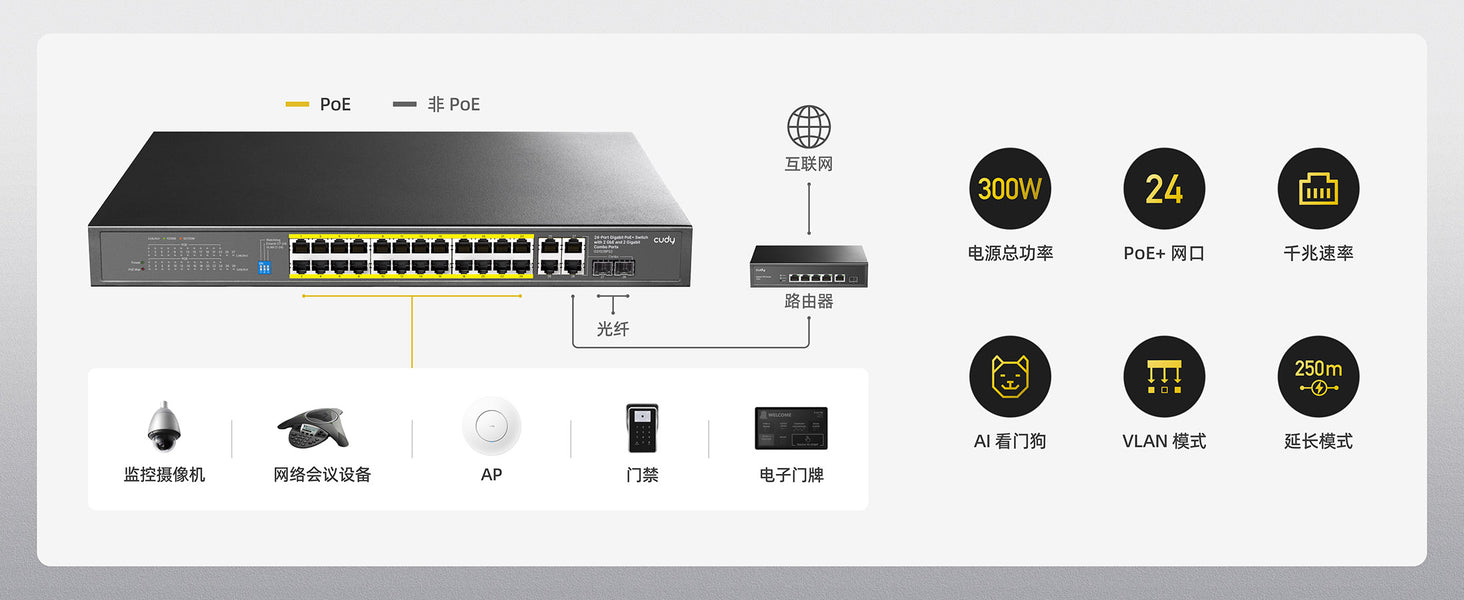 | 智能供电管理 (PoE) | 当 PoE 用电超过额定功率时,将优先断开最后上电的设备供电 | |