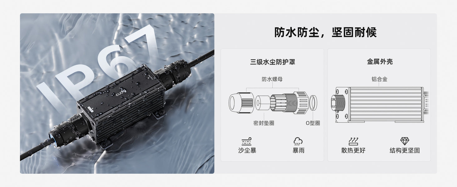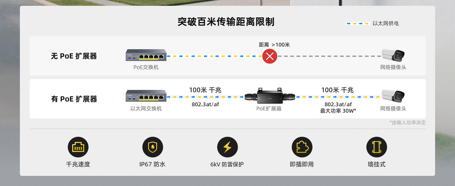 - 实际可用功率 = 上行供电功率 − 线路损耗 − 设备自身功耗(功耗详情请参见规格表)。建议上行供电使用支持标准 IEEE PoE(54V)的 PoE 交换机或 PoE 适配器。