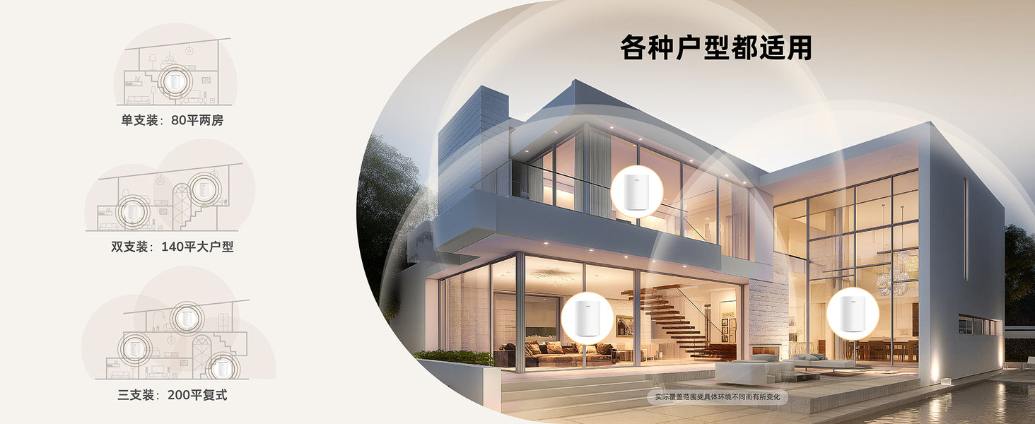 2 Pack: 200 m² (2100 sq ft) 3 Pack: 270 m² (2900 sq ft) Applied to wireless backhaul situation. Place in the center of each floor, with a maximum of three obstacles to each room. |